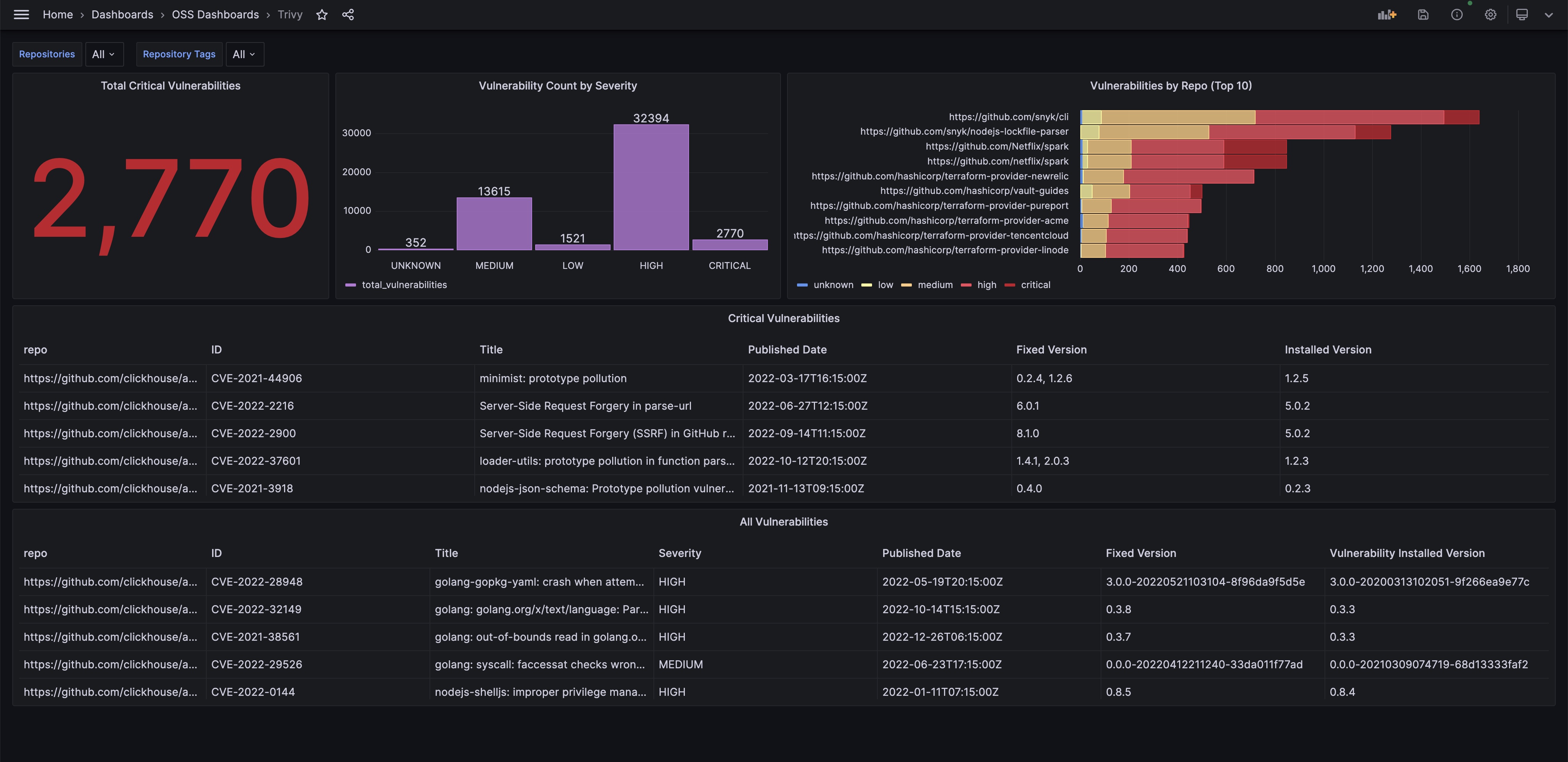 Now that we have data flowing for our repos from these two scanners, we can begin making use of it 🎉. These examples will use the trivy_* tables. Similar SQL can be composed for the grype_* tables as well.