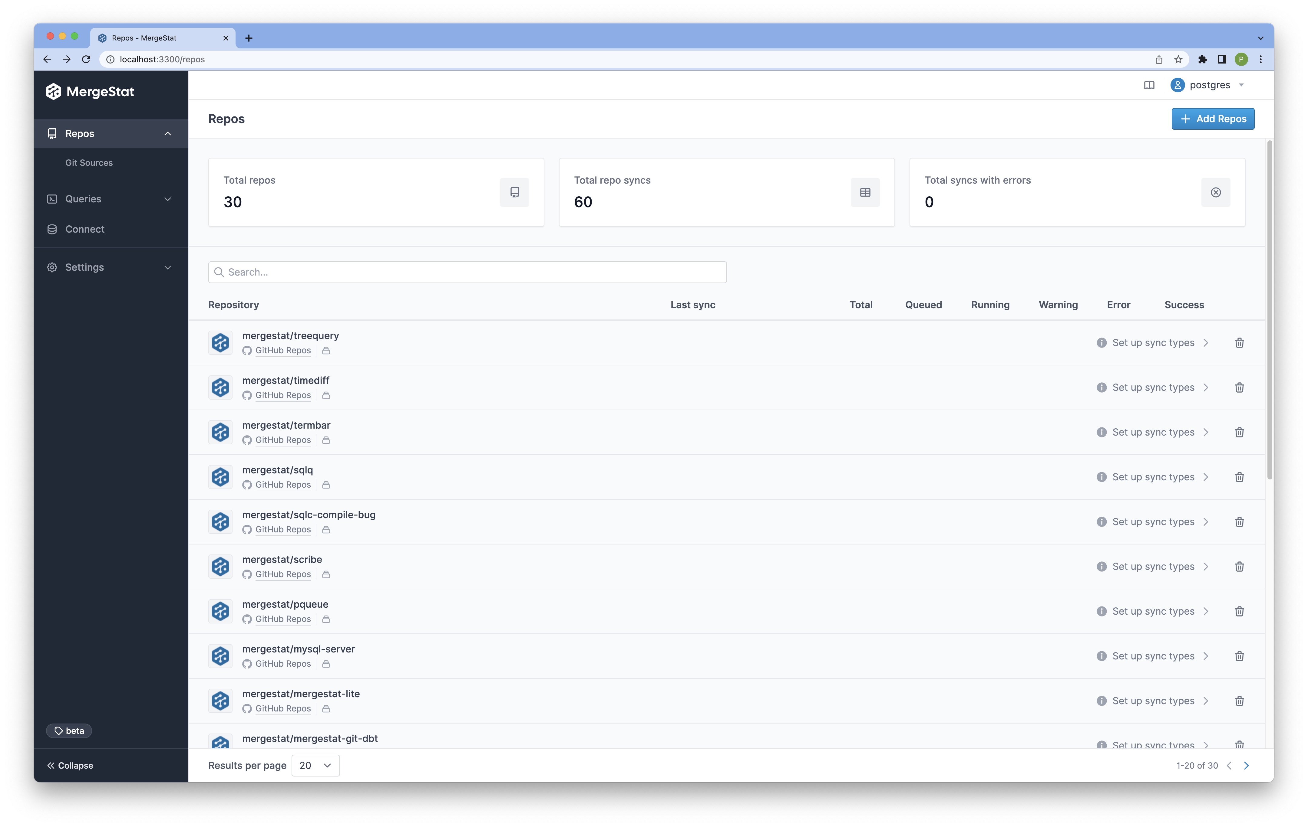 To get started, first you'll need a running instance of MergeStat. Check out our guide here on running an instance locally and adding your repos to begin.